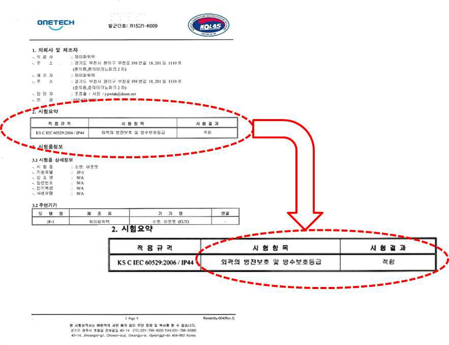 시험기관의 방진보호 및 방수보호 테스트에 적합 판정을 득하였습니다.
