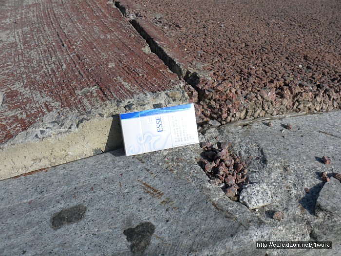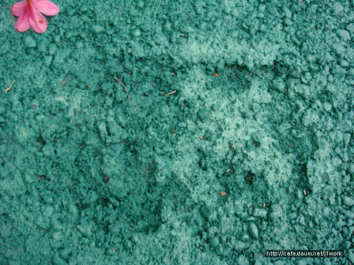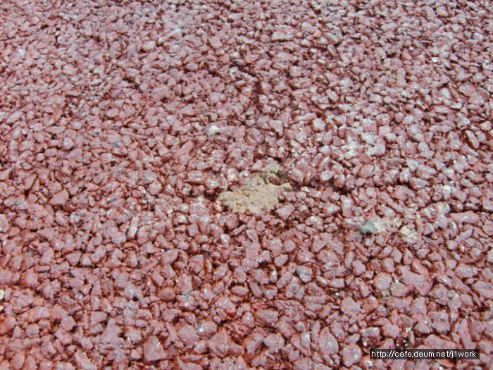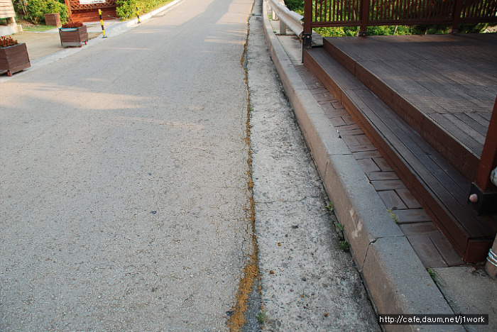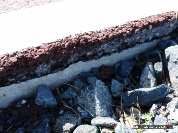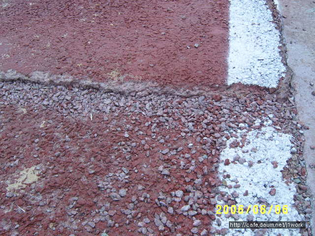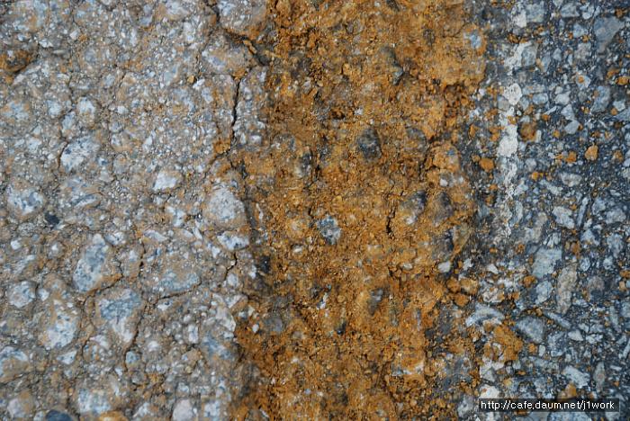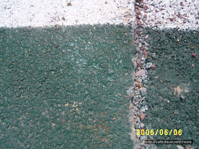 위 도로 우측에 파손된 쪽을 보시면 황색의 도로였다는 것을 알 수 있습니다. 저질 안료를 쓴 덕에 탈색이 되어 칼라를 잃어버렸습니다. 자세히 보시면 자외선에 의하여 바인더의 끊김 현상이 벌어져 실선들이 많이 보이실겁니다. 이 도로는 끝이 막다른 길이라 차량의 통행이 거의 없는 도로입니다. 이 도로가 지금까지 버틸 수 있었던 것은 차량 통행이 없어 그나마 버티고 있는 것 입니다.