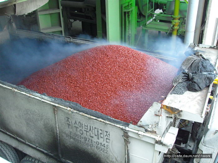 덤프트럭에 적재된 칼라아스콘인 우리의 CS - PHALT(적색)