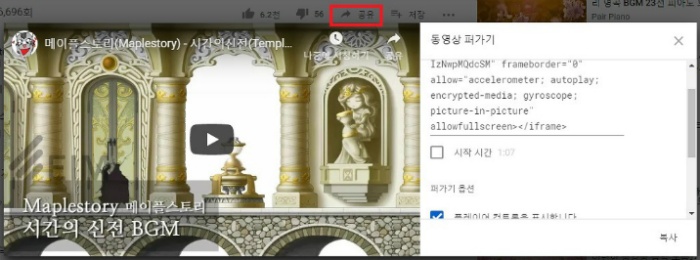 1. 원하는 음악을 검색해서, '공유 → 퍼가기' 에 들어가서 iframe 소스를 복사해.