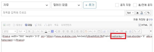 3. 아래 사진처럼 ?rel=0 뒤에 &autoplay=1(자동 재생)를 붙여넣기 하고