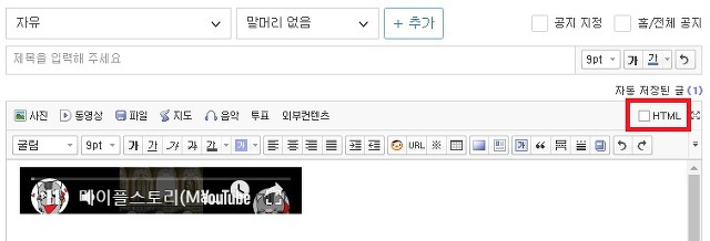 4. html 체크를 다시 해제하면 유튜브 재생바가 보이면서 브금이 자동으로 재생되는 걸 확인 할 수 있어.