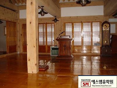 여느 한옥집과 같이 복원된 소래교회는 실내로 들어가보니 막 베어낸 소나무를 이용해서 지운 건축같은 느낌을 준다.