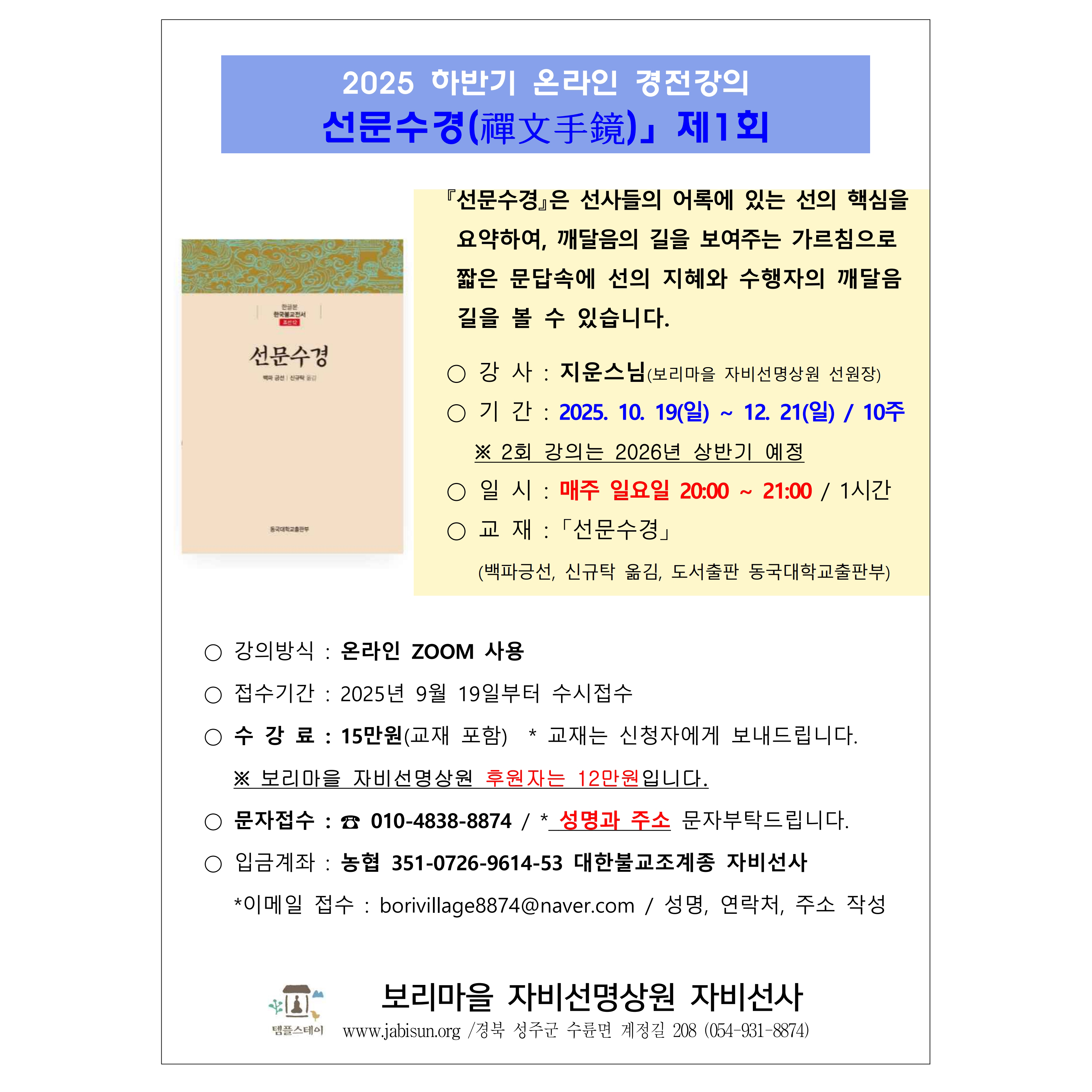 ○ 교 재 : 선문수경(백파긍선, 신규탁 옮김, 도서출판 동국대학교출판부)
