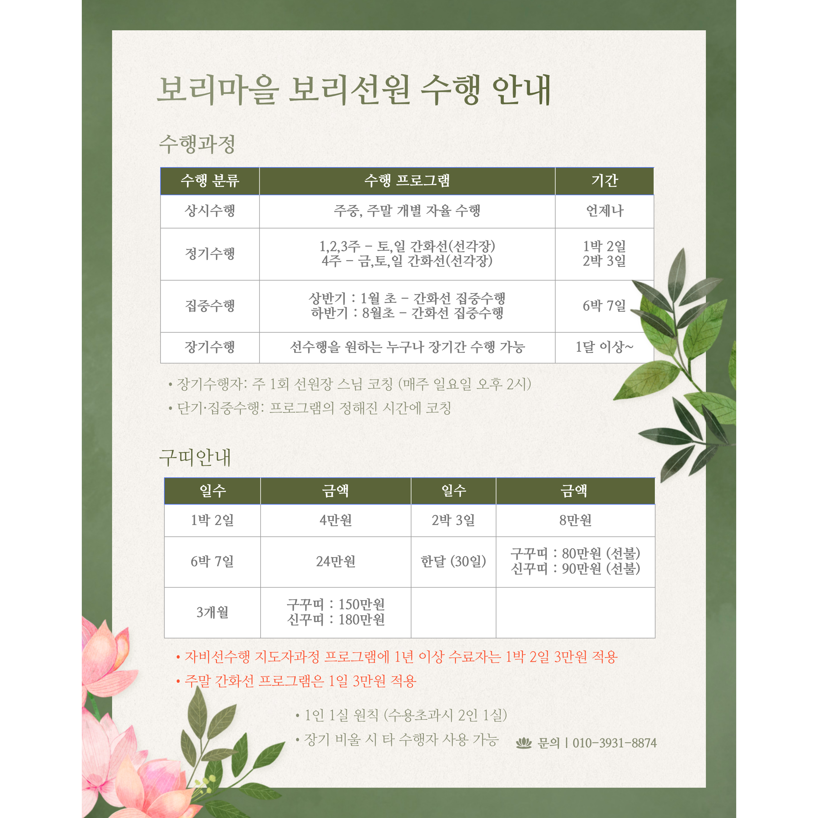 • 자비선수행 지도자과정 프로그램에 1년 이상 수료자는 1박 2일 3만원 적용