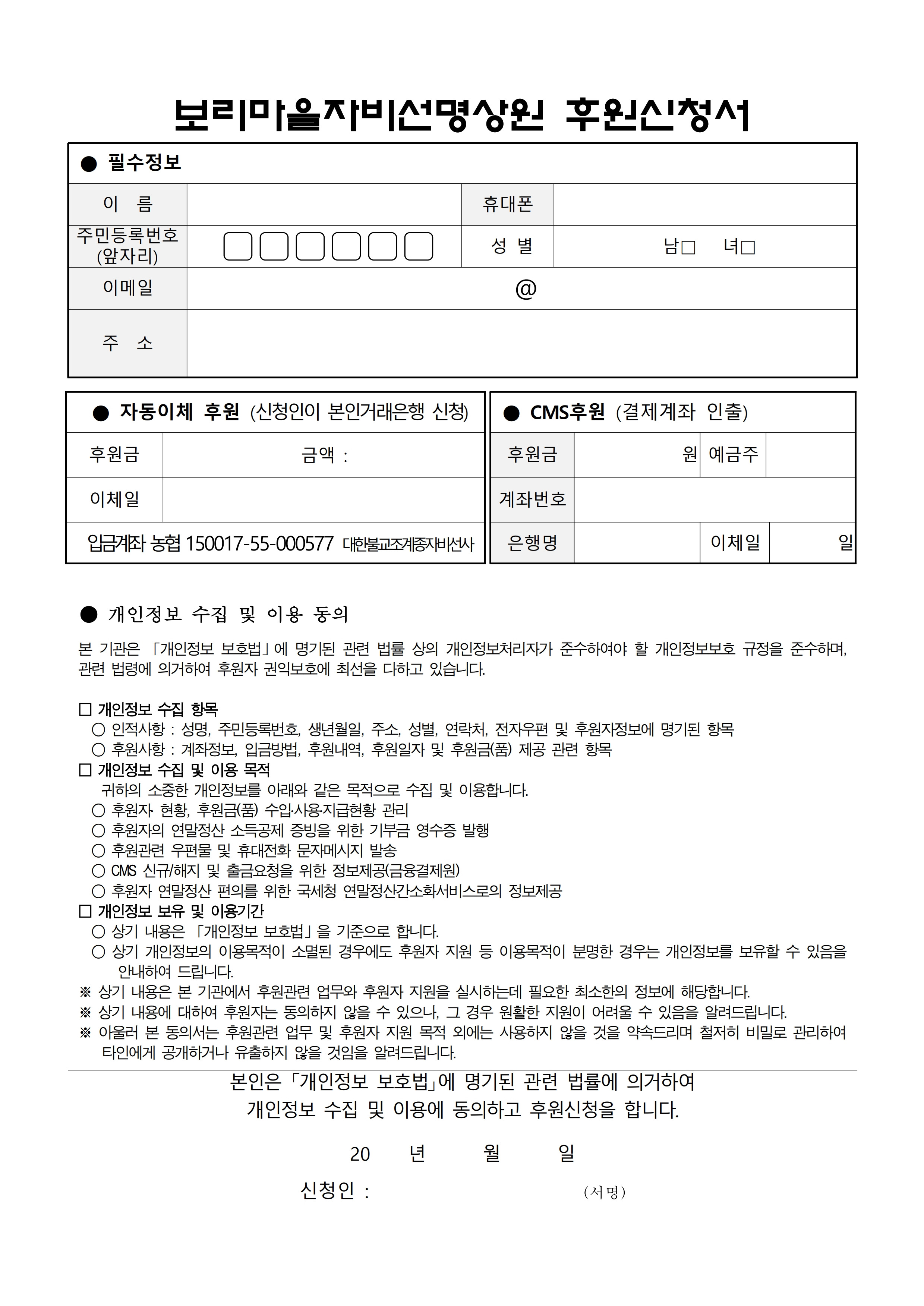 자비선사 후원신청서 CMS자동이체 양식 다운받기