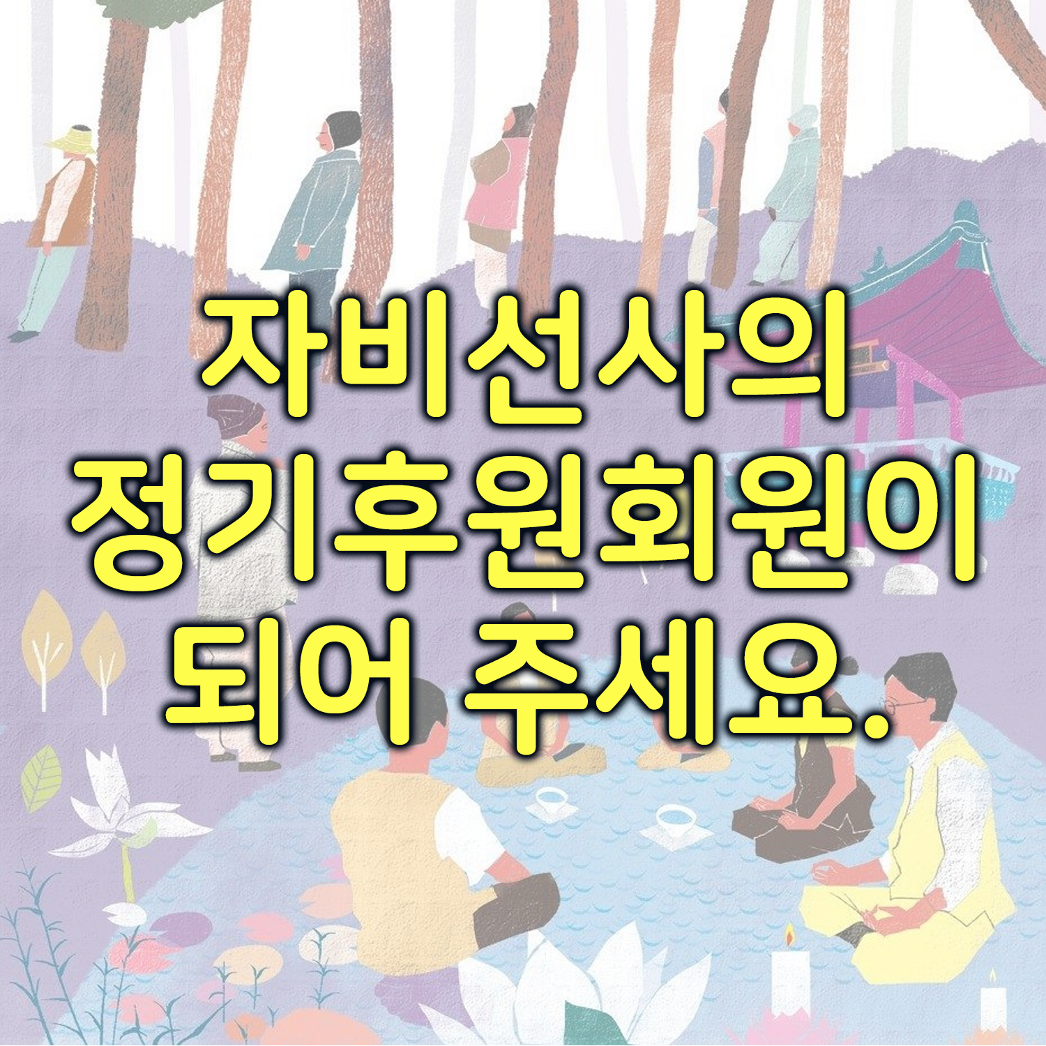 저희 자비선 명상센터는 스님의 큰 뜻에 따라 수행자들의 보다 원활한 수행을 돕기 위해 후원회원을 모집하고 있습니다. 후원회원의 한 구좌 가입은 나를 비롯한 모든 이들의 수행을 통한 행복한 삶과 죽음의 문제를 해결하는 길이기도 합니다.