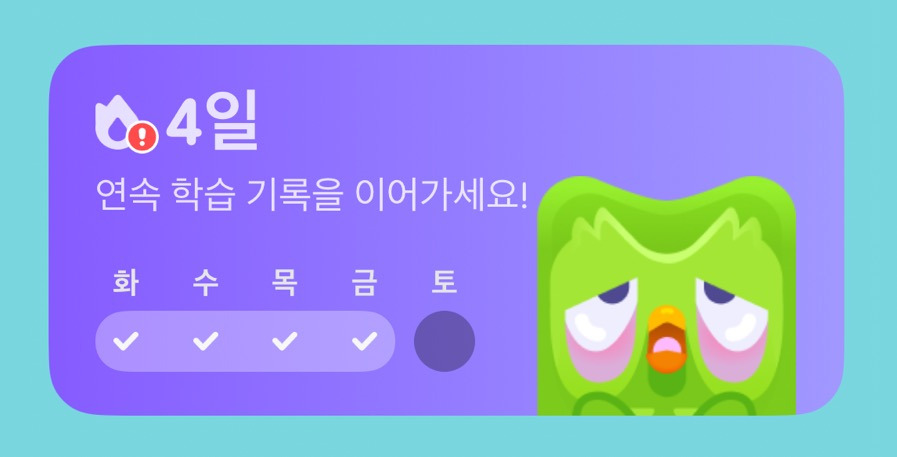 요즘 듀오링고를 하고 있는데 공부하는 것을 까먹지않게 계속 찡찡대주는 듀오링고… 고마워요