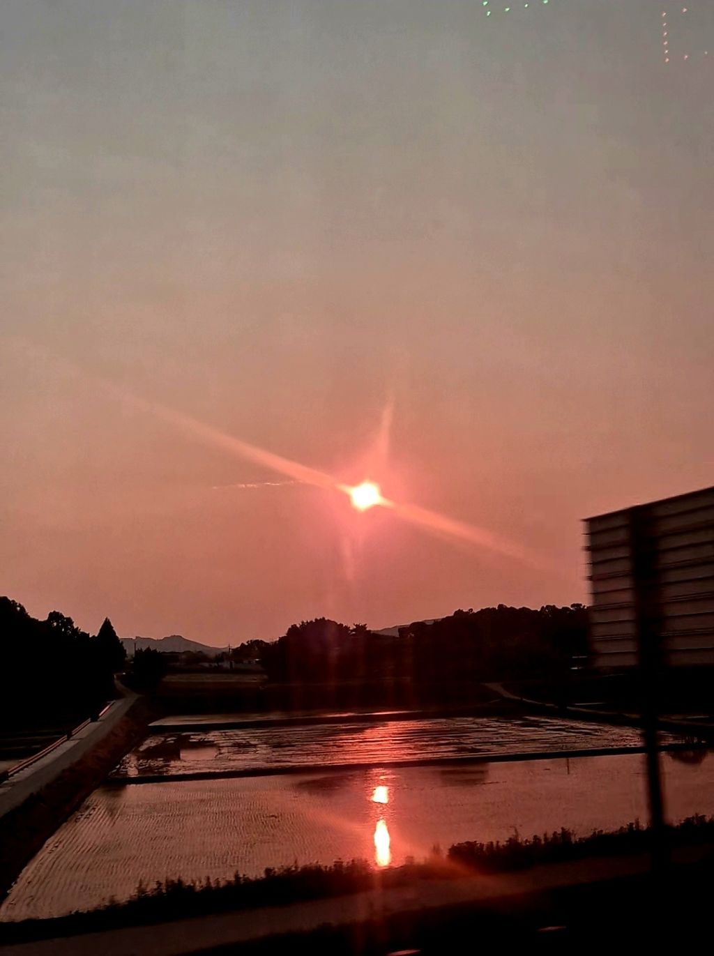 노을로 인해 하늘은 핑크빛으로 물들어 있었고, 논밭 위로는 햇빛이 흐드러지게 쏟아져 마치 유리알처럼 반짝이는 아름다운 풍경이 펼쳐졌습니다.