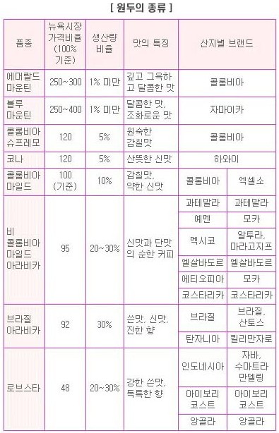 남미, 콜롬비아산으로 부드럽고 쓴맛이 적어 많은 사람이 애음하는 커피 콩이다.