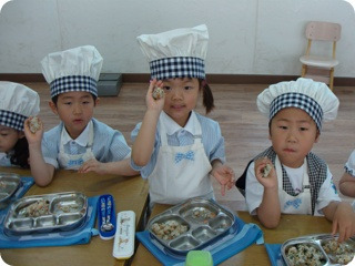 마. 유아 요리활동은 탐구생활의 발달! 요리는 다양한 과학실험의 장이기도 해요. 요리활동 재료들에서 농산물이 어떻게 자라며, 무엇이 음식을 익게 하는지, 어떻게 배추나 호박 등이 소금에 절여지는지, 열에너지에 의해 음식에 어떤 변화가 생기는 지 자연스럽게 알 수 있습니다. 식료품을 선택하고 손질하고 준비하고 요리하고 먹는 데는 수학적 개념과 수학적 지능이 필요해요. 장보면서 계산할 때, 양을 계량할 때, 재료를 분류해서 구입할 때, 재료를 익히는 시간을 재야 할 때 등 이런 과정을 거치면서 유아는 자연스럽게 물건의 단위, 양과 무게의 개념, 1:1대응, 등분하기, 돈의 단위 등을 이해하게 됩니다. |
