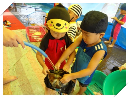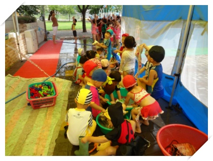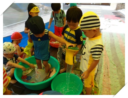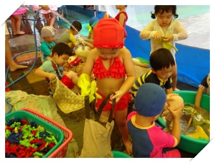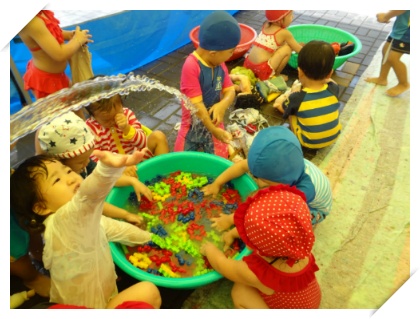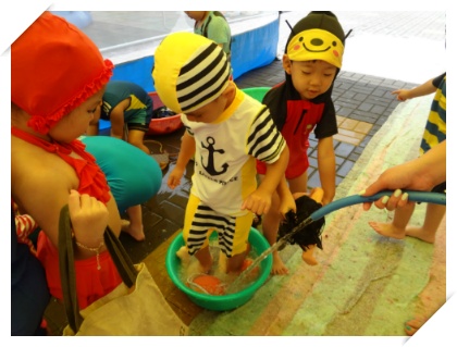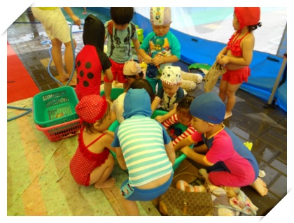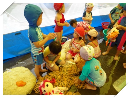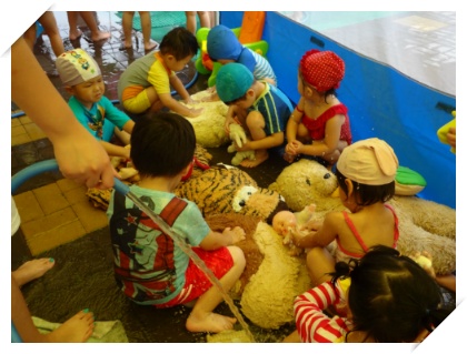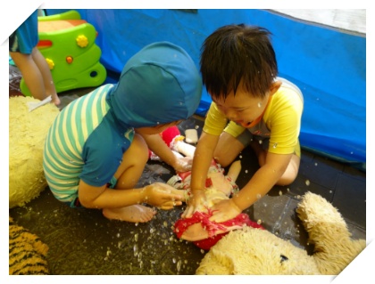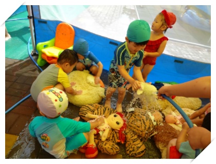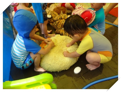 깔깔대기도 하고 뽀득뽀득 목욕도 시키다 보니 어느새 더워졌어요. 모두들 풀장 속으로 들어가 첨벙첨벙 시원한 물놀이를 즐기네요~