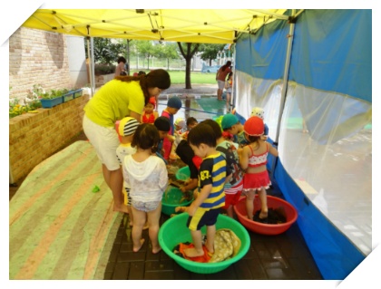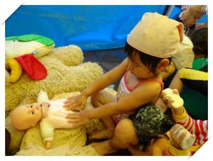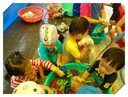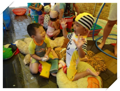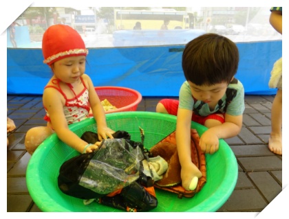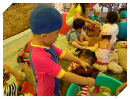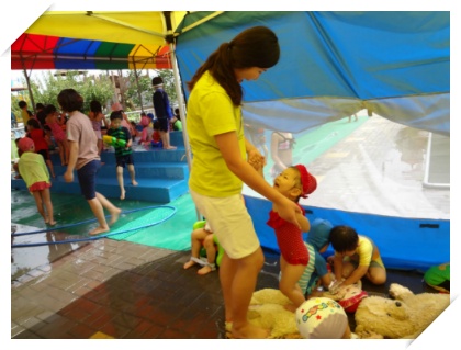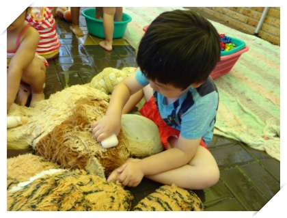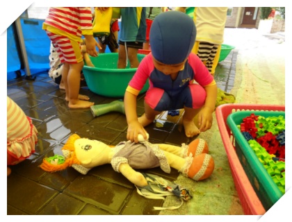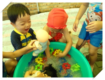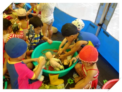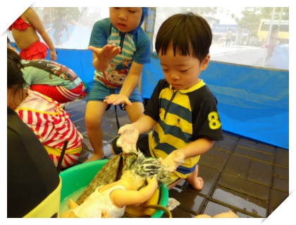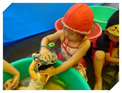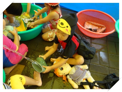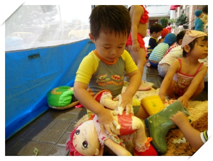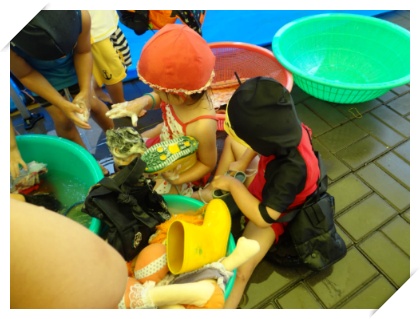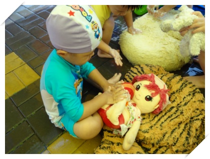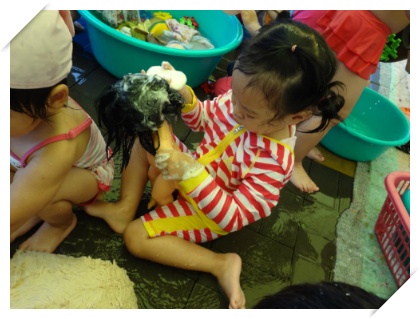 신나는 여름 방학을 앞두고, 예쁜반에서 즐겁게 놀이했던 인형들을 깨끗하게 목욕시켰어요. 그늘막 텐트 아래 털석 주저앉아 비누로 뽀글뽀글~ 깜찍한 우리 예쁜이들 !