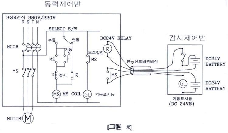 [그림 1]에서와 같이 동력제어반(Motor Control Center : M.C.C)에서는 전동기의 구동을 위한 Sequence 회로를 구성하고 전동기를 제어한다. 감시제어반에서 펌프를 제어하기 위하여 배관, 배선을 포설하고 감시제어반에 기동스위치 및 기동램프를 연결한다. 동력제어반의 SELECT S/W를 연동위치로 하고 감시제어반에서 기동스위치를 ON하면 MS COIL에 AC220V가 투입되어 전자접촉기 MS가 동작하고 MOTOR가 동작한다. 이때 MS의 보조접접이 작동하고 동력제어반의 기동표시등과 감시제어반의 기동표시등이 동시에 점등한다. 이와 같이 동작하는 경우에는 감시제어반의 기동스위치 및 기동표시등을 AC220V용을 사용하게 되어 DC24V를 사용하는 감시제어반에 AC220V가 항상 투입되어 수신기 결선 및 고장 수리시 감전사고 또는 안전사고의 우려가 발생할 수 있다.