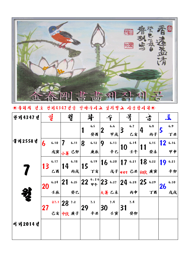 단기4347년,2014년도 7월달력 절후표,연꽃,칠언 명구 대련8폭 병풍/춘강 제작
