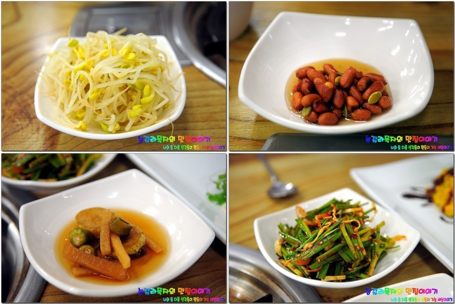 콩나물과 땅콩볶음. 장아찌와 부추절임이다..