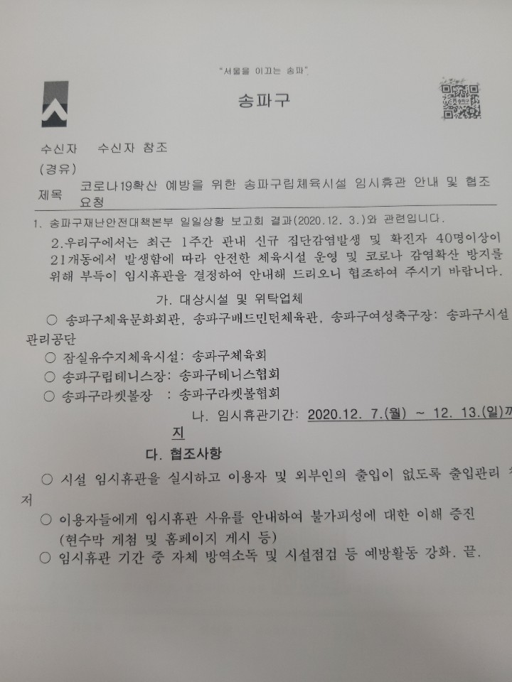12월7일(월) ~ 12월13일(일) 7일간 잠실유수지 체육센터 임시휴관에 들어갑니다.