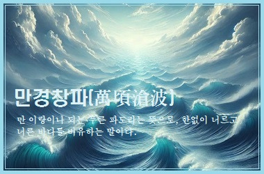 만경창파(萬頃蒼波)는 '만(萬) 이랑(頃)의 푸른 물결(蒼波)'이라는 뜻으로, 한없이 넓고 푸른 바다를 이르는 표현입니다. 단순히 자연의 풍경을 말할 뿐 아니라, 광대함, 평온함, 무한함, 깊은 사색을 상징하는 시적 표현입니다.