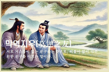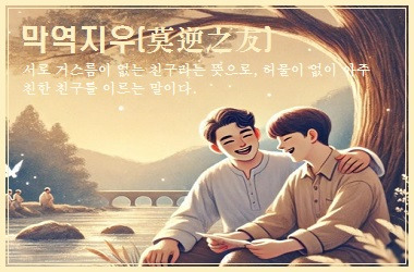 막역지우(莫逆之友), 이 말은 참된 마음으로 서로 거역할 수 없을 만큼 매우 친한 벗을 의미합니다. 막역지우는 '거역할 수 없는 친구'라는 뜻이에요. 여기서 '막(莫)'은 '없다', '역(逆)'은 '거스르다', '지(之)'는 '~의', '우(友)'는 '친구'를 의미합니다. 이 말은 어떤 상황에서도 서로 거스르지 않고, 깊은 신뢰와 우정을 나누는 친구를 가리킵니다.