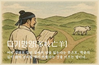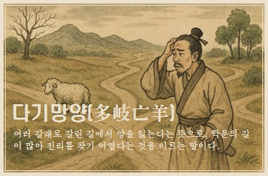 갈림길(岐)이 많아 양을 잃었다는 뜻이다. 배움의 길이 여러 갈래로 나뉘어 진리 찾기가 어렵다는 의미로, 가르침이 다양해 어느 것을 따라야 할지 헷갈린다는 비유로도 쓰인다.