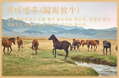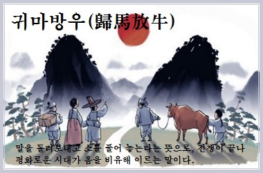 귀마방우(歸馬放牛)는 말을 돌려보내고 소를 풀어놓는다는 뜻으로 전쟁 중에 쓴 말과 소를 산과 들판으로 놓아 보내어 수레나 쟁기를 끌게 하는 것으로 전쟁이 끝나고 태평한 세상을 말한다.