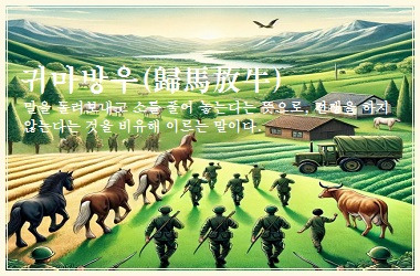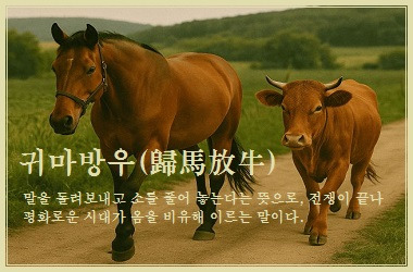 전쟁이 끝나고 평화로운 시절이 된다. 귀마방우(歸馬放牛)라는 사자성어를 통해 전쟁이 끝나고 평화로운 시절이 찾아온 것에 대해 이야기해보겠습니다. 이 사자성어는 말과 소를 놓아주고 부리지 않는다는 뜻으로, 전쟁이 끝나고 평화로운 시절이 되었음을 상징하는 말입니다. 이는 긴 전쟁이나 갈등이 끝난 후 찾아오는 평화의 소중함과 그 안에서의 안정을 강조하는 말입니다.