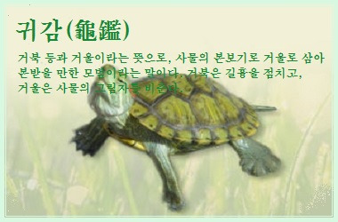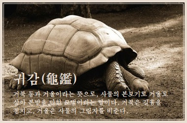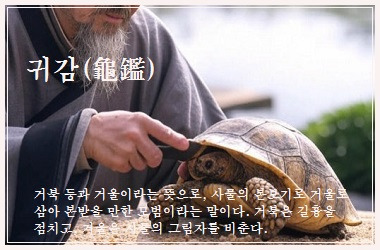 우리가 흔히 쓰는 감상(鑑賞), 감별(鑑別), 감정(鑑定) 등이 바로 그 예이다. 그러므로 귀감(龜鑑)이란 말은 사람의 길흉이나 미추를 판단해주는 기본 도구였던 셈이다. 즉 길흉을 점쳐주는 귀(龜)와 미추를 알려주는 감(鑑) 앞에서 자신을 돌아보고 바로 잡는다는 뜻이다.