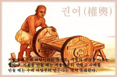 ‘권여(權輿)’도 사물의 시초(始初)를 뜻하는 단어다. 權은 ‘저울(추) 권’, 輿는 ‘수레 여’로 ‘권여’는 저울대와 수레 바탕이라는 뜻이다. 저울을 만들 때는 저울대부터 만들고, 수레를 만들 때는 수레 바탕부터 만든다는 데서 유래한다.