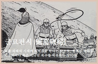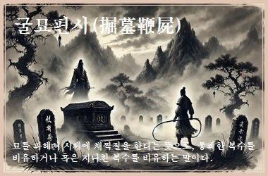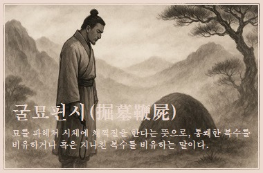 굴묘편시(掘墓鞭屍)는 무덤을 파고 시체를 채찍질한다는 뜻으로, 통쾌한 복수의 의미로도 쓰이지만, 때로는 복수심이 지나쳐 도를 넘는 행동을 경계하는 말로도 사용된다. 굴묘편시(掘墓鞭屍)는 복수심이 극에 달해 상대방이 죽은 후에도 그에 대한 원한을 풀지 못하고 시체를 훼손하는 행위를 가리킨다. 이는 복수심이 얼마나 강렬할 수 있는지를 보여주지만, 동시에 지나친 복수심이 결국 도를 넘는 행위로 이어질 수 있다는 경고의 의미를 담고 있다.