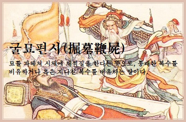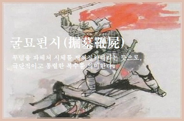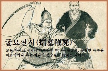 무덤을 파헤쳐 시체를 채찍질하다라는 뜻으로, 극단적이고 통렬한 복수를 의미한다. 주로 큰 원한이나 복수심을 품고 죽은 자에게도 복수를 감행하는 강한 원망과 미움을 표현한 말이다.