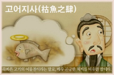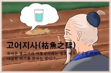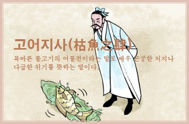 고어지사(枯魚之肆)란 목마른 물고기의 어물전이라는 말로 매우 곤궁한 처지나 다급한 위기를 뜻하는 말이다.