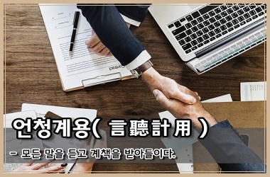 어떤 일을 처리할 때 한 사람이 내놓은 의견을 받아들이고(言聽) 그대로 실행한다(計用)는 이 성어가 이러한 경우를 가리킨다. 언청계종(言聽計從)이라 해도 같다.