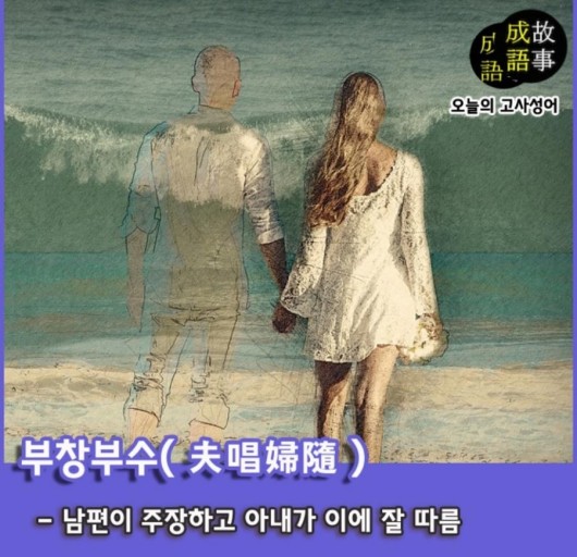 부창부수(夫唱婦隨)란 남편이 부르고 아내가 이에 따른다는 뜻이다. 화목하고 화합하는 남녀를 의미한다. 가장 좋은 부부의 인연이라면 그건 바로 화목이다. 결혼을 앞둔 사람이라면 새겨들을 말이다.