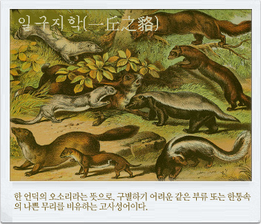 고약한 냄새를 풍기는 족제빗과의 포유동물 오소리는 생긴 것도 호감을 못줘 한 곳에 모여 살면 어느 놈이 어느 놈인지 좋고 나쁜 것을 구별할 수 없다. 한 언덕(一丘)에서 사는 오소리(之貉)라는 성어도 서로 다를 바 없는 똑 같은 부류나 한통속인 나쁜 무리를 비유한다.