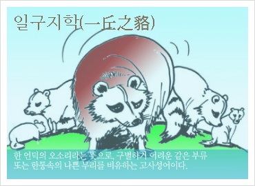 한 언덕의 오소리라는 뜻으로, 구별하기 어려운 같은 부류 또는 한통속의 나쁜 무리를 비유하는 고사성어이다.