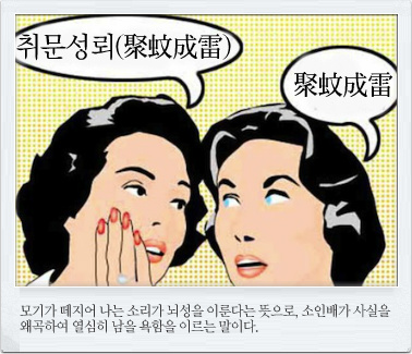형제는 그만 무참해져서 의론을 거두었다. 박지원은 이 고사를 취문성뢰(聚蚊成雷)로 소개하고 있다. 풍문에 현혹되어 판을 그르친다는 뜻이다.