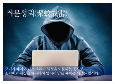 삼인성호(三人成虎)라. 세 사람의 입이 있지도 않은 범을 만들어 낸다. 적우침주(積羽沈舟)라. 가벼운 새털도 쌓으면 그 무게에 배가 그만 가라앉는다.