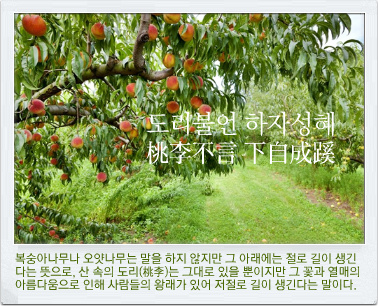 전해오는 말에 복숭아나무나 오얏나무는 말하지 않더라도 그 밑에는 길이 절로 생긴다고 했다.