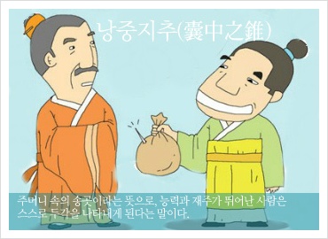 주머니 속의 송곳이라는 뜻으로, 능력과 재주가 뛰어난 사람은 스스로 두각을 나타내게 된다는 말이다.