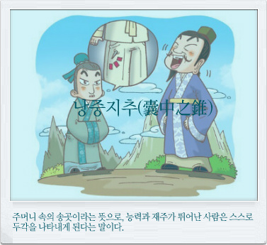 낭중지추란 주머니 속의 송곳이라는 뜻인데, 곧 재능이 뛰어난 사람은 숨어 있어도 남의 눈에 드러난다는 뜻입니다. 하지만 좋은 점도 주머니 속의 송곳처럼 드러나지만 나쁜 점도 드러나게 마련입니다.