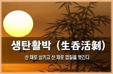 산채로 삼키고 껍질을 벗긴다는 살벌한 이 성어도 남의 시문을 냉큼 자기 것으로 만든다는 과장된 표현이다. 표절뿐만 아니고 남의 지식이나 경험을 아무런 비판 없이 받아들이는 태도를 말하기도 한다. 활박생탄(活剝生呑)으로 써도 똑 같다.