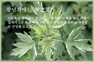 하지만 당장에 먹을 해묵은 약쑥이 없다고, 바깥에서 3년 묵은 약쑥만 찾아다니느라 7년이 지나도록 쑥은 못 찾고 병만 깊어졌다.