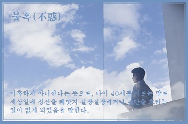 여기서 불혹이란 미혹되지 않는다는 말이다. 판단이나 생각이 올바르지 않아서 외물에 쉽게 현혹되어 빠지는 것을 미혹이라고 하는데 사람 나이 마흔이면 세상에 모든 일에 대하여 시비분변(是非分辨)을 바르게 하고, 감정 또한 적절하게 절제 할수 있어 미혹되지 않는다는 것이다.