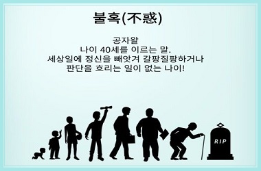 공자(孔子)가 40세에 이르러 직접 체험한 것으로, 논어(論語) 위정편(爲政篇)에 언급된 내용이다. 공자는 일생을 회고하며 자신의 학문수양의 발전과정에 대해 나는 15세가 되어 학문에 뜻을 두었고(吾十有五而志于學), 30세에 학문의 기초를 확립했다(三十而立). 40세가 되어서는 미혹하지 않았고(四十而不惑) 50세에는 하늘의 명을 알았다(五十而知天命). 60세에는 남의 말을 순순히 받아들였고(六十而耳順) 70세에 이르러서는 마음 내키는 대로 해도 법도를 넘어서지 않았다(七十而從心所欲不踰矩)라는 말을 남겼다.