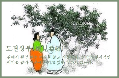 도견상부(道見桑婦)란 이와 같이 누구나 생각하고 행동할 수 있는 일을 가지고 자기만 한다는 착각에 빠져 작은 이익을 찾아 뛰어들었다가 기왕에 가지고 있던 것마저 잃게 된다는 뜻이다.