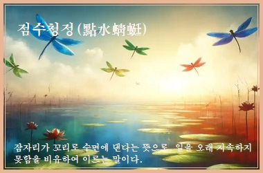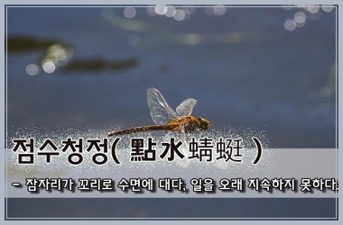 잠자리가 꼬리를 물속에 넣었다가 금방 날아오르는 모습을 청정점수(蜻蜓點水)라고 한다. 앞뒤를 바꾸어 쓴 점수청정(點水蜻蜓) 성어도 같은 뜻으로 유래도 동일하다.