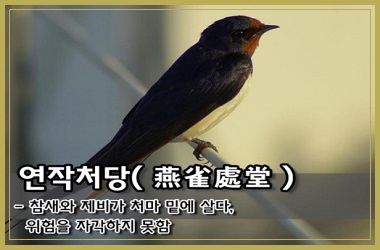참새와 제비가 처마 밑에 산다는 뜻으로, 안심하고 있어 재앙이 닥쳐오는 것도 모른다는 말이다.