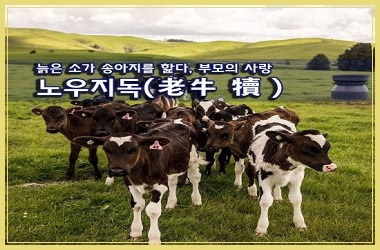 늙은 소가 송아지를 핥는다는 뜻으로, 자식에 대한 부모의 사랑을 이르는 말이다. 어미 소가 어린 송아지를 핥아주듯 부모의 지극한 자녀 사랑을 말하며, 후한서(後漢書) 열전(列傳)에 나오는 다음 이야기에서 유래하였다.
