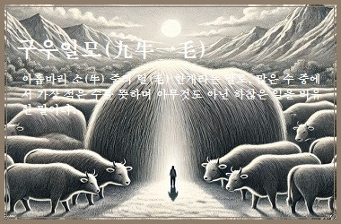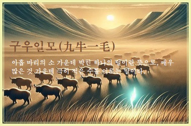 아홉 마리 소에서 뽑은 털 한 가닥이라는 뜻으로, 엄청나게 많은 것 중의 아주 작은 부분, 즉 지극히 미미한 존재를 의미한다. 이 표현은 전체에 비해 아주 작은 부분이거나 대수롭지 않은 것을 비유할 때 사용된다. 예를 들어, 엄청난 재산을 가진 사람이 아주 적은 돈을 잃었을 때 그 금액이 큰 영향을 미치지 않는 것처럼 구우일모는 어떤 상황에서 중요하지 않은 작은 부분을 나타낼 때 적합한 표현이다.
