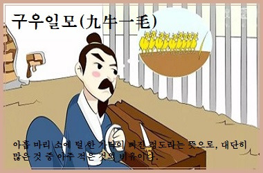 구우일모(九牛一毛), 앞 두 글자 '구우(九牛)'는 '아홉 마리 소'다. '일모(一毛)'는 '털 한 올'이다. 이 두 부분이 합쳐져 '아홉 마리나 되는 소 가운데 겨우 털 한 가닥'이란 의미가 성립한다. '넓은 바다 가운데 좁쌀 한 알'을 뜻하는 '창해일속(滄海一粟)'과 함께 '매우 적음'을 비유하는 표현이다.